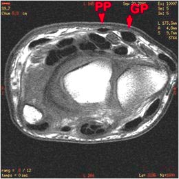 A à D : Coupes axiales du poignet de proximal en distal : Aspect normal du FRC (grand palmaire, fléchisseur radial du carpe) (GP) et du Petit palmaire. Rapports étroits de ces structures avec le nerf médian et les tendons fléchisseurs.