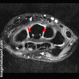 B - IRM coupe axiale, pondération T2 : Interruption corticale nette en regard des formations kystiques (flèches rouges). Ces formations, siègent typiquement en regard de zones d'insertions ligamentaires, en l'occurrence ici, des ligaments palmaires extrinsèques. A noter le net épaississement du tendon de l'extenseur ulnaire du carpe.