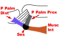 - soit par atteinte musculaire avec rupture des insertions sésamoïdiennes du court fléchisseur sur le sésamoïde latéral ou de l'adducteur du pouce (type 3b) sur le sésamoïde médial * la plaque palmaire proximale accompagne la musculature proximale et peut s'associer à une lésion du ligament collatéral accessoire